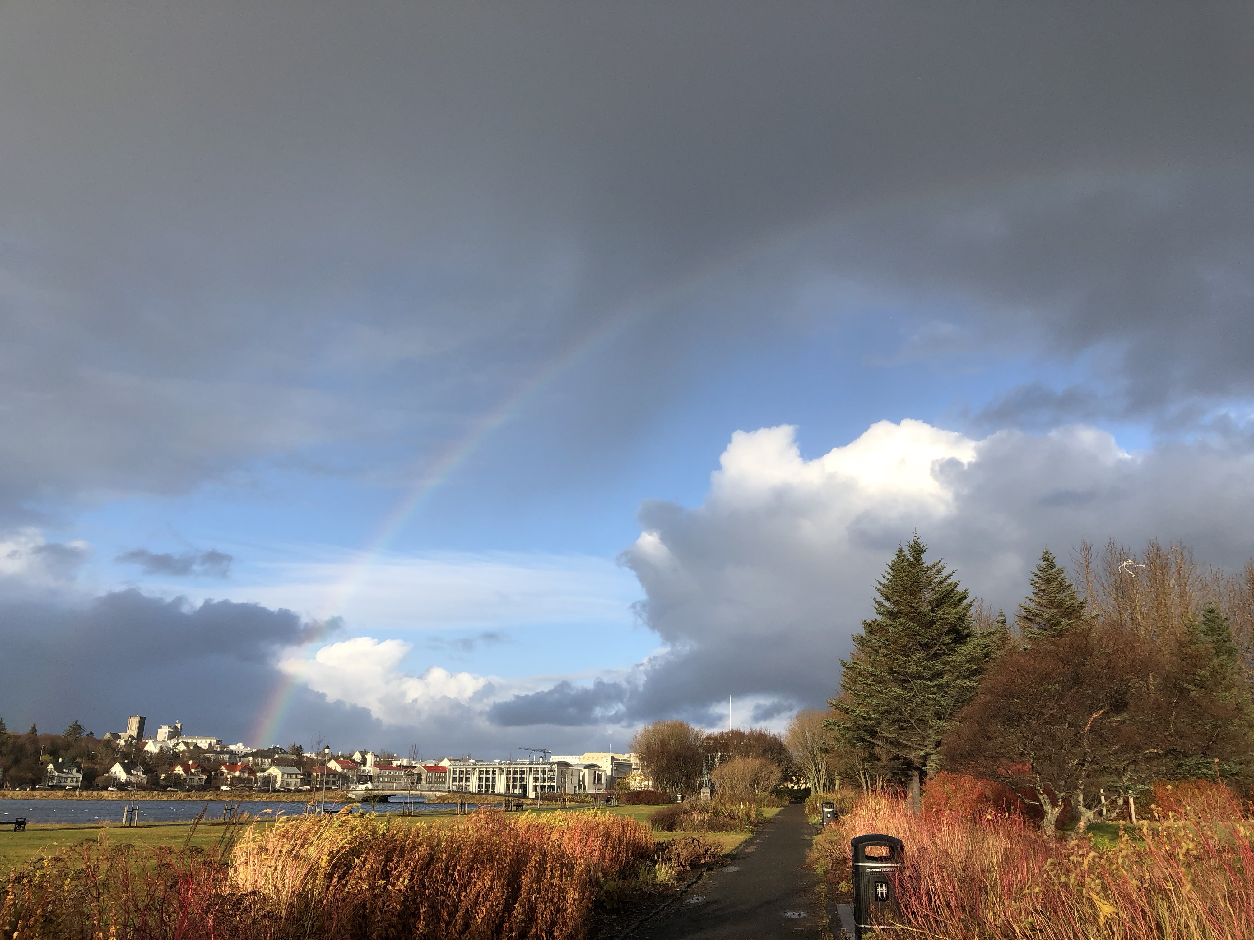We walked through a park and saw some geese, ducks, and a rainbow!
